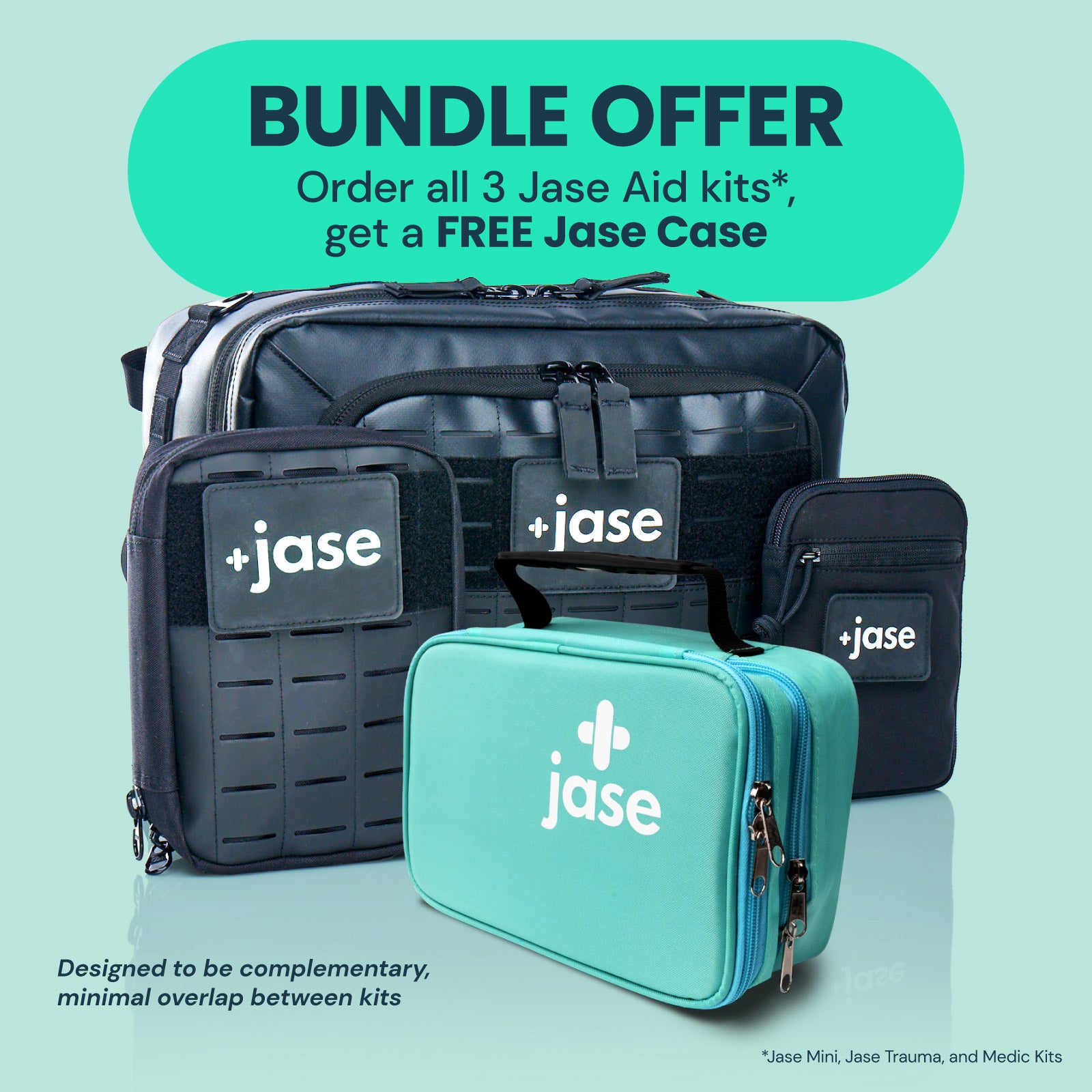 The Jase Aid Mini, Trauma, and Medic kits each serve a unique purpose with little overlap. That means if you want essentials like chest seal, wound wash, and antibiotics, you’ll need all three. Bundle them for complete, no-gap preparedness. And if you pre-order all 3 kits, you'll get a FREE Jase Case†.